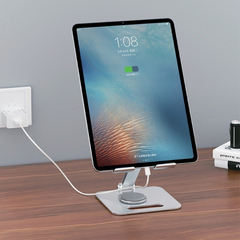 - سهولة الشحن: صُمم الحامل بفتحة سفلية تسمح بمرور سلك الشحن بسهولة، مما يتيح لك استخدام الجهاز وشحنه في وقت واحد دون عوائق.