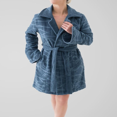 - روب باللون الأزرق بياقة عريضة وجيوب وحزام عريض فالمنتصف